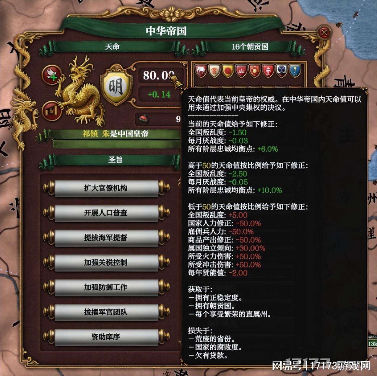 于是,他们在《欧陆风云4》1.20版本天命DLC中,不仅大幅提升中华帝国的基础数据,还量身定制了一套“天命系统”,允许大明可通过外交或战争,将周边国家变成朝贡国,以便达成隐形统治。
